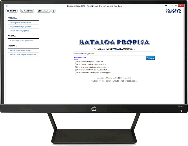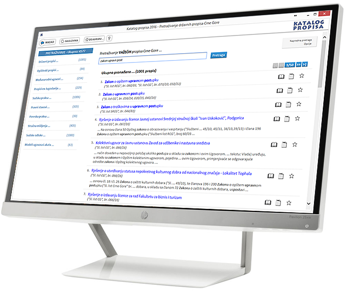 Vođeni idejom koju promovišu svjetski pretraživači interneta o pronalaženju prave informacije unošenjem samo par riječi, postavili smo osnovu “Kataloga propisa” na brzo i relevantno pretraživanje.
