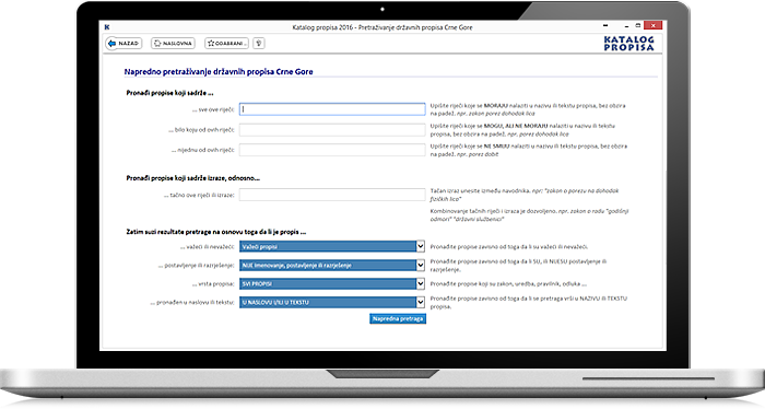 Takođe, u njemu možete suziti rezultate pretrage na osnovu toga da li je propis važeći, nevažeći, zakon, odluka, uredba, da li se tražena riječ ili izraz pojavljuje u naslovu ili testu i sl.